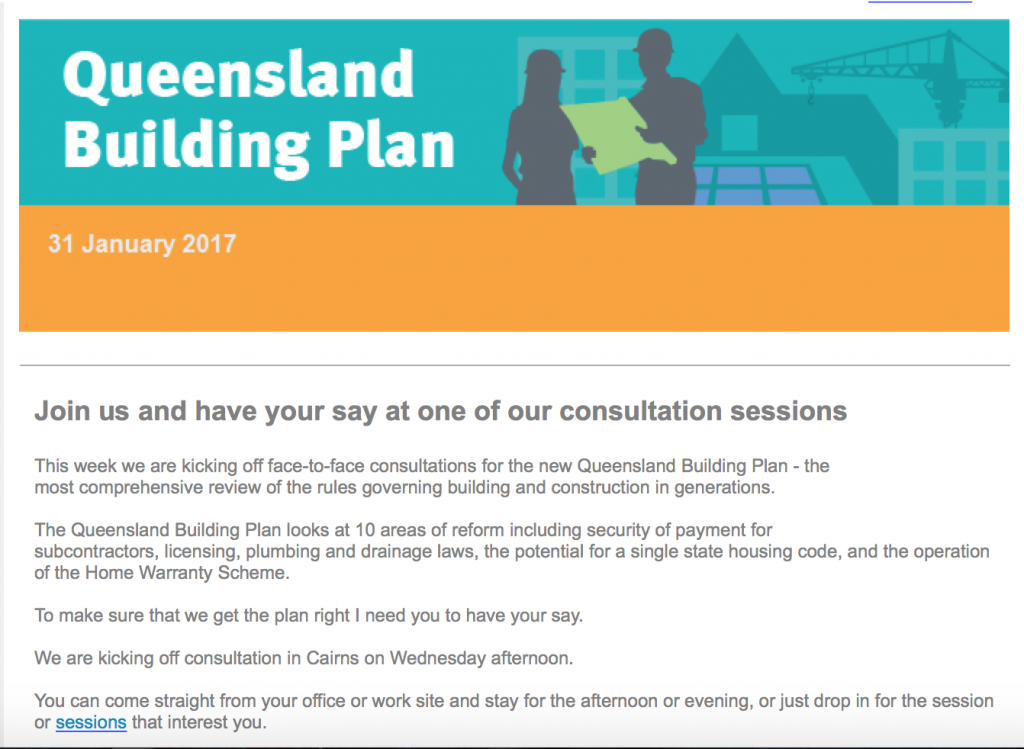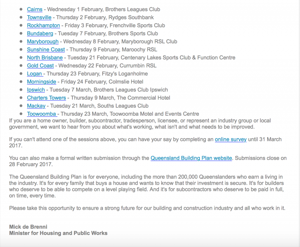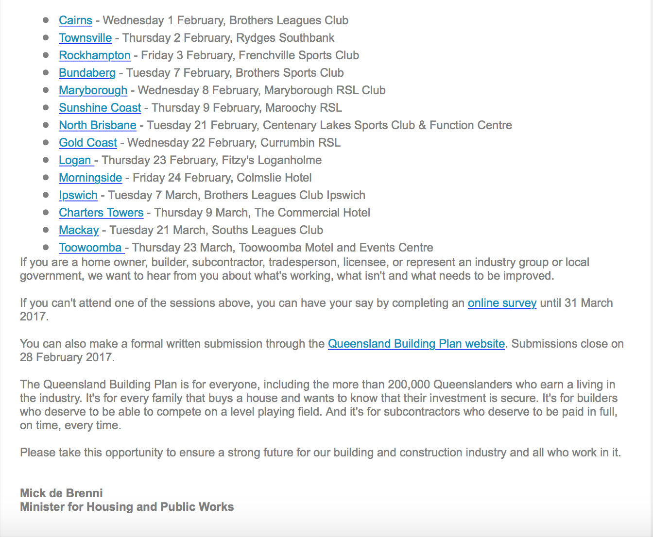 This is our best chance to date, to have our say to the Queensland Government and Minister For Housing Mick De Brenni about changes that are desperately needed to the system, to give subcontractors and suppliers security of payment and to protect or get rid of retentions altogether.